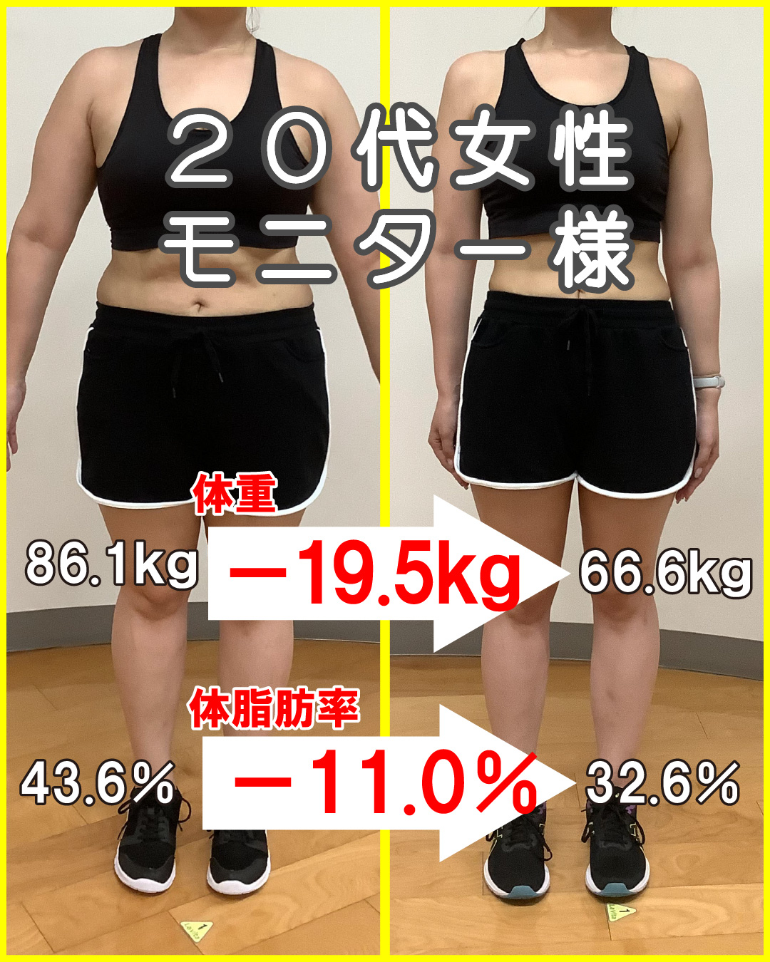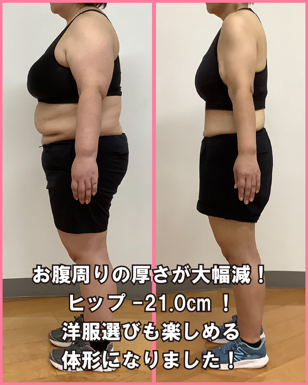 また脂肪燃焼のため有酸素運動の時間を長く確保するよう促し、来館出来ない日は自宅でも積極的に運動。停滞期もなく、少しずつ着実に体重を落としていけました。